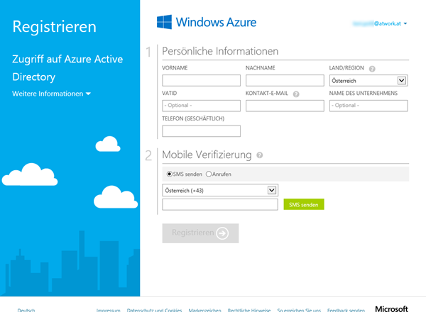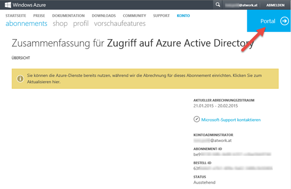 Sonst, beim ersten Öffnen des Links erfolgt eine Umleitung auf https://account.windowsazure.com/signup?offer=MS-AZR-0110P, wo nun die “Office 365”-Azure Subscription einmalig angelegt werden muss.