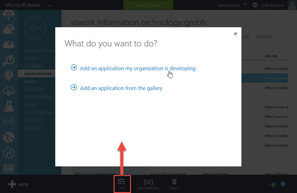 Im Menü “Active Directory” wird der Office 365 Tenant ausgewählt. (Der Office 365 Tenant wurde durch die Subscription automatisch im Azure Portal zur Verwaltung hinzugefügt.) Hier drinnen wird eine neue App mit “Add” aus dem unteren Menü hinzugefügt.