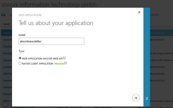 Nun wird der App-Name (hier “atworknewsletter”) und der Typ (Web oder Native) angegeben.