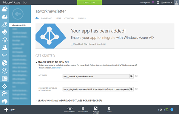 Empfehlenswert ist in “Configure” ein Logo der App upzuloaden, damit die App ansprechend im Office 365 Portal angezeigt wird. Das Logo sollte 215x215 Pixel groß sein – es wird für die Office 365 App-Darstellung im Format 94x94 Pixel angezeigt und sollte einen (Farb-) Hintergrund haben.