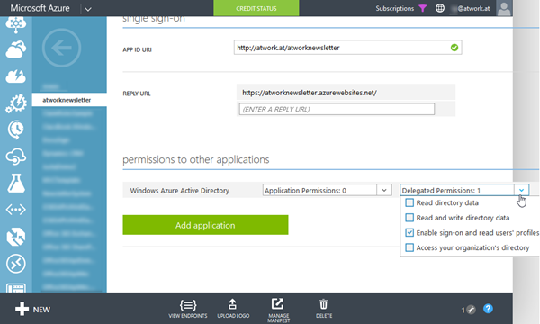 Jetzt folgt im Azure Portal das Erstellen der eigenen App, die integriert werden soll. In unserem Beispiel verwenden wir eine Web-App mit dem Namen “atworknewsletter”, die bereits Authentifizierung mit AAD verwendet. Es kann aber auch jede andere App (ohne AAD Authentifizierung) verwendet werden.