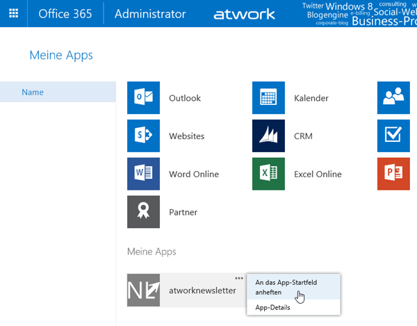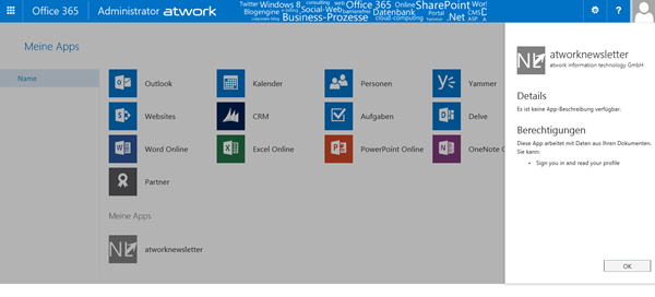 Nachdem der Admin eine App im AAD bereitgestellt hat, kennt Office 365 diese App und kann sie auch verwenden. In der Weboberfläche von Office 365 kann nun jeder (berechtigte) Benutzer diese App zu seinem eigenen App Launcher hinzufügen.