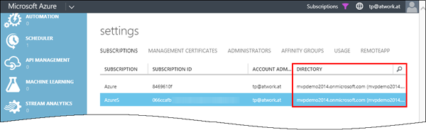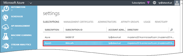 Here are two Azure subscriptions (Azure and AzureS) managed by one AAD (mvpdemo2014.onmicrosoft.com – which is a more than one year old, no longer active Office 365 demo 30-days-trial).