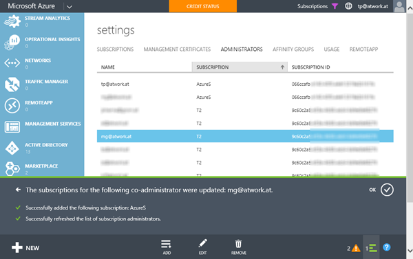 The second problem – in my case – was that I could not add other Co-Admins to the specific Azure subscription. The portal always delivered an error: “The account ‘xy@atwork.at’ could not be made a co-administrator due to a directory error.” Troublesome…