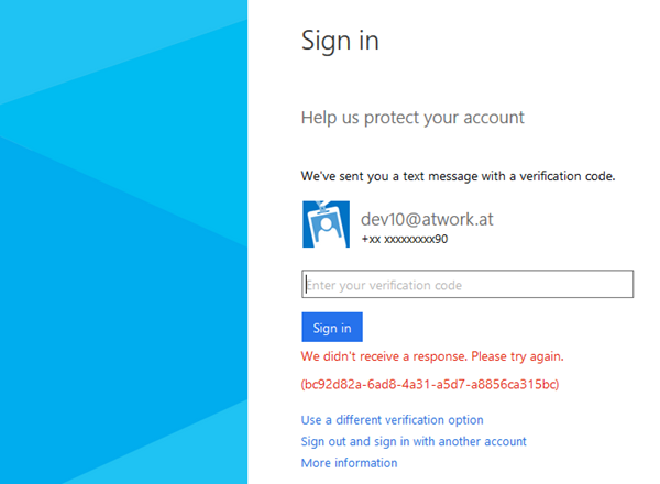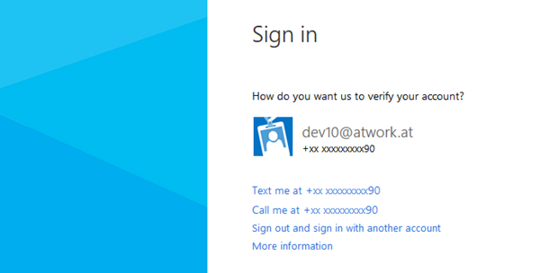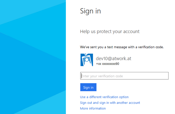 After the login was successful there follows the second step where Azure wants to get additional information from the user, depending on how the admin configured the two factor authentication. In case of sending a verification code as SMS to a mobile phone this code must be received and entered here.