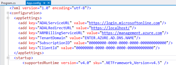 Ich habe zunächst einmal das Beispiel ConsoleApp-Billing-Usage angesehen. Hier müssen natürlich zuerst die eigenen Daten und die Berechtigungen gesetzt werden. Das erste Compile lädt die erforderlichen NuGet Packages nach und wirft gleich einen Fehler mit dem Hinweis im Code, dass die AppSettings korrekt eingetragen werden müssen: