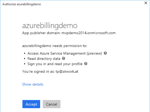WebApp-Billing-MultiTenant ermöglicht es dem angemeldeten Benutzer die Azure Graph API und die Usage API im Namen des Users aufzurufen und zeigt auch den OAuth flow.