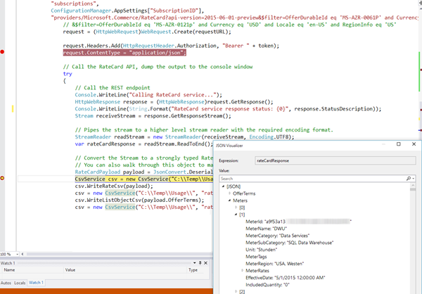 Wenn man das Sample ConsoleApp-Billing-RateCard ansieht (und ev. gleich in das Usage-Sample integriert), sieht man, dass es nach demselben Prinzip funktioniert. Hier wollen wir die Daten einer MSDN-Subscription in Euro und mit deutschen Bezeichnungen: