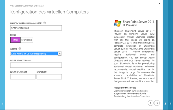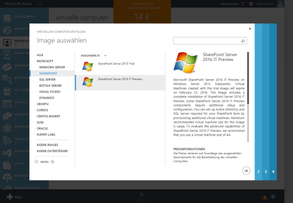 Das VM-Image SharePoint 2016 IT Preview ist aus dem Katalog verfügbar.