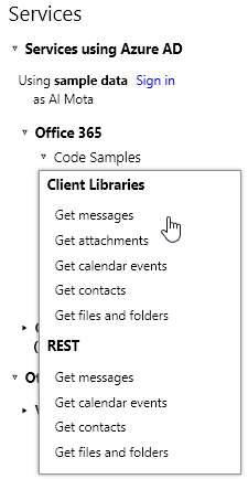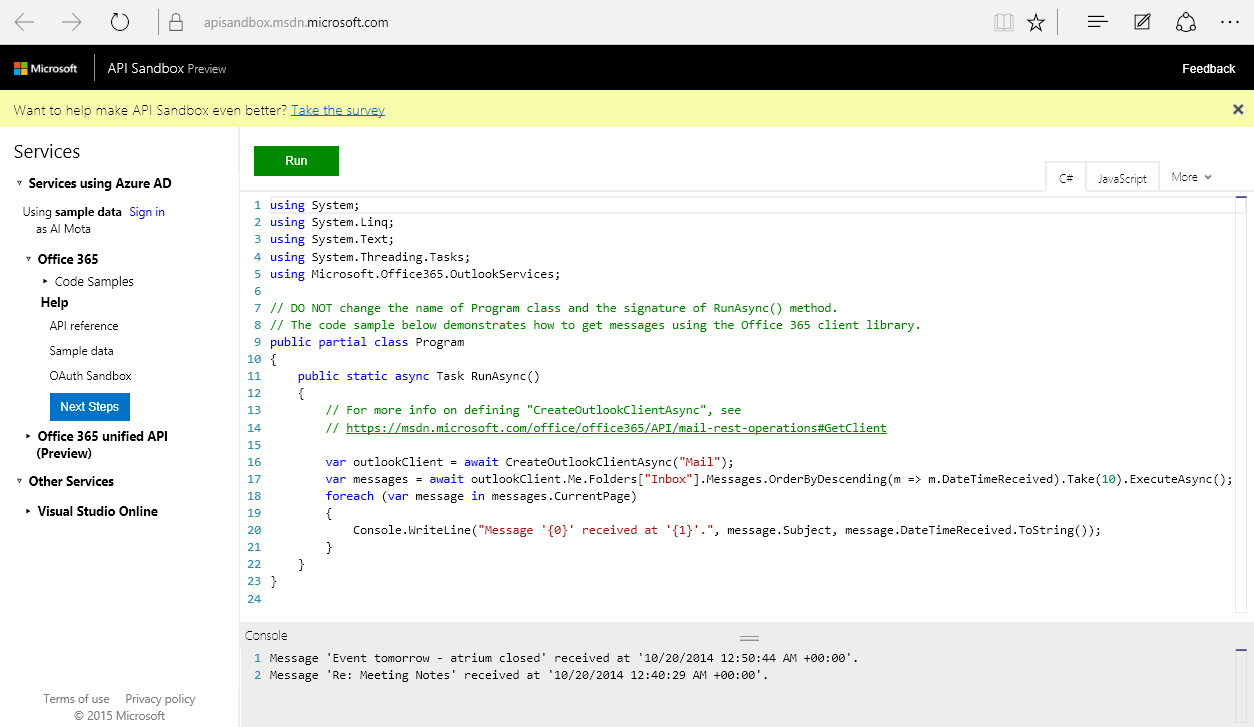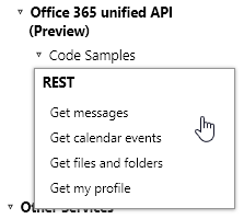 API Sandbox (Preview) – zeigt Code Samples mit (Unified) Office 365 API