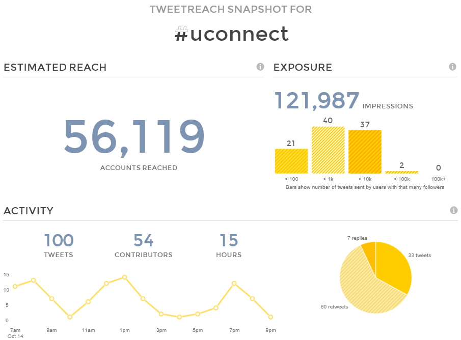 If we look at tweetreach.com, we see this result for #uconnect. (This is the cost free report just for the last 100 tweets.)