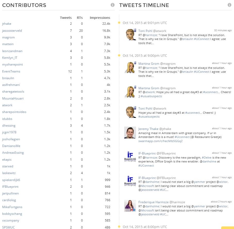 The reporting was done on the last conference day, Wednesday, 14th October, at 11pm and pulled numbers from Twitter with the hashtag #uconnect for the last 7 days with plusonesocial.com tool.