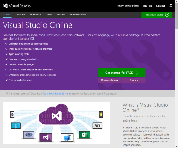 Visual Studio Online ist keine eigene Integrierte Entwicklungsumgebung, es ist “alles andere”. VS Online stellt ein Set an Tools in der Cloud bereit, um mit Visual Studio oder anderen IDE Umgebungen alleine oder im Team zusammenzuarbeiten, so lautet die kurze Beschreibungen auf der VS Online Website.