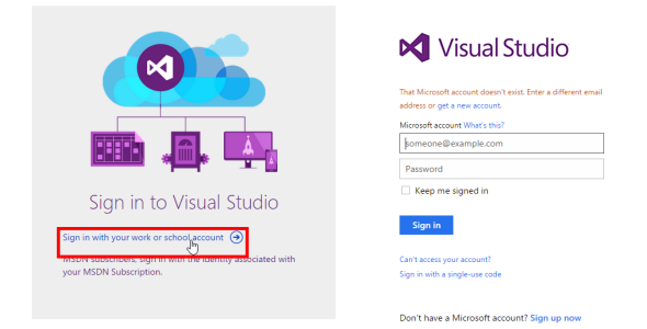 Nachdem wir nicht voneinander unabhängige Microsoft Konten nutzen wollen, benötigen wir die Anmeldung mit einer Organisations-ID. Der entsprechende Link ist auf der linken Seite verfügbar: “Sign in with your work or schoool account”.