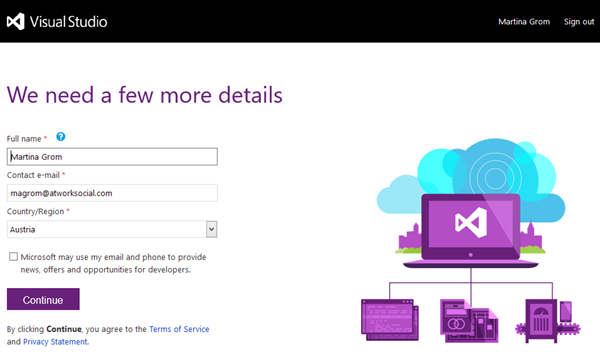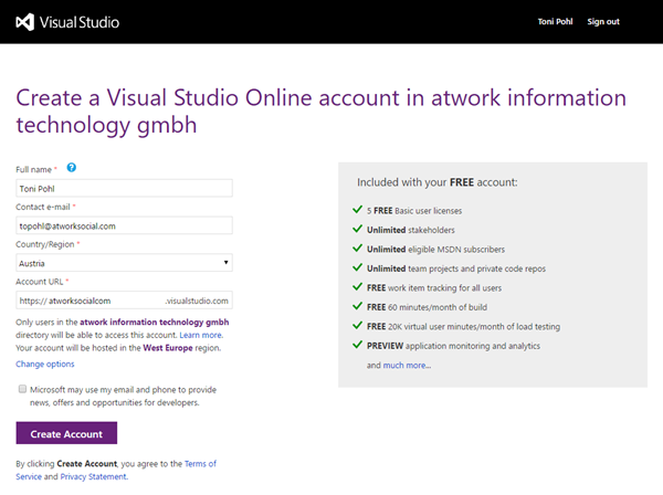 Nun müssen nur noch die Konto-Daten und die Region bestätigt und die Adresse des eigenen VS Online Services eingetragen werden. Die URL muss natürlich eindeutig und noch nicht vergeben sein und folgt diesem Muster: https://[mycompany].visualstudio.com