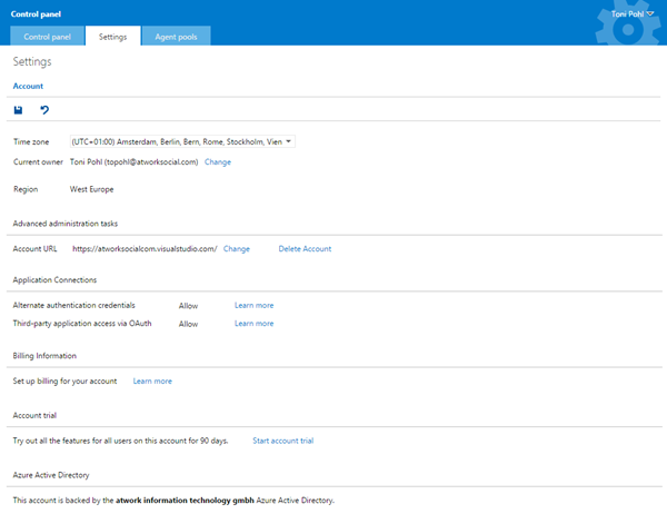Neben Time Zone, URL und weiteren Settings wird hier auch der “Owner” des VS Online Services definiert. Das ist standardmäßig natürlich immer jene Person, die den VS Online Space eingerichtet hat.