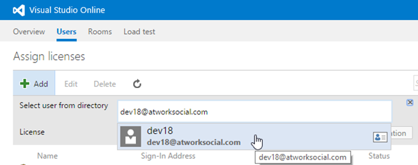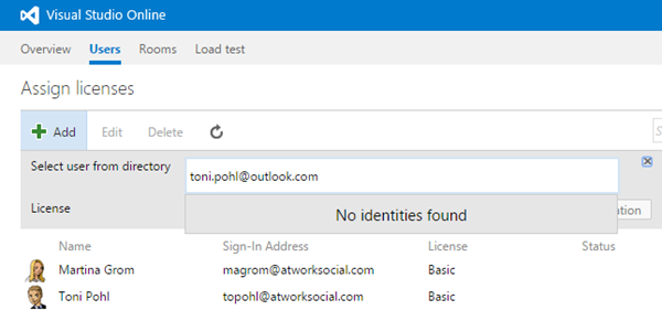 Zurück zu VS Online: Wir können den User nun hinzufügen – er wird im AAD gefunden.