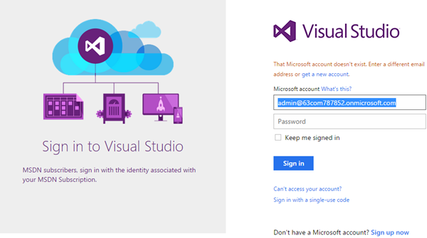 Oben seht ihr, dass der User mit einem AAD-Konto (einer Office 365 Test-Domain 63COM787852.onmicrosoft.com) in dem bestehenden VS Online Service hinzugefügt wurde. Die Anmeldeseite für den Benutzer geht jedoch dann fälschlicherweise immer von einem Microsoft-Account aus, wie der folgende Screenshot zeigt.