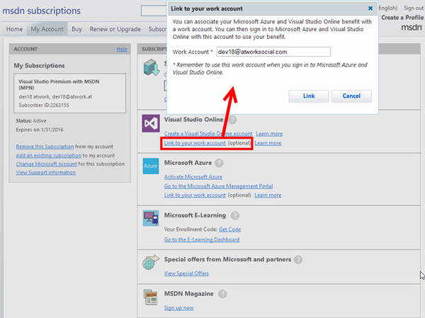 Hier ein Beispiel eines Users, der ein MSDN besitzt und sich mit einem Microsoft Konto an MSDN angemeldet hat. In der MSDN-Subscription, kann eine Zuordnung im MSDN-Portal unter “My Account” erfolgen, wie hier: