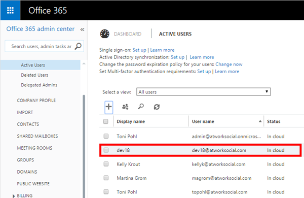 Wichtig dabei: Der User, hier dev18@atworksocial.com, muss natürlich im atworksocial.com-AAD existieren (und ein Login und Kennwort besitzen)… Hier erfolgte die Anlage direkt im Office 365 Portal des Tenants.