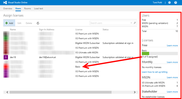 In diesem Beispiel etwa ist nur 1 von 5 Basic Lizenzen verbraucht und die restlichen Benutzer haben ein MSDN-Konto mit VS Online assoziiert.