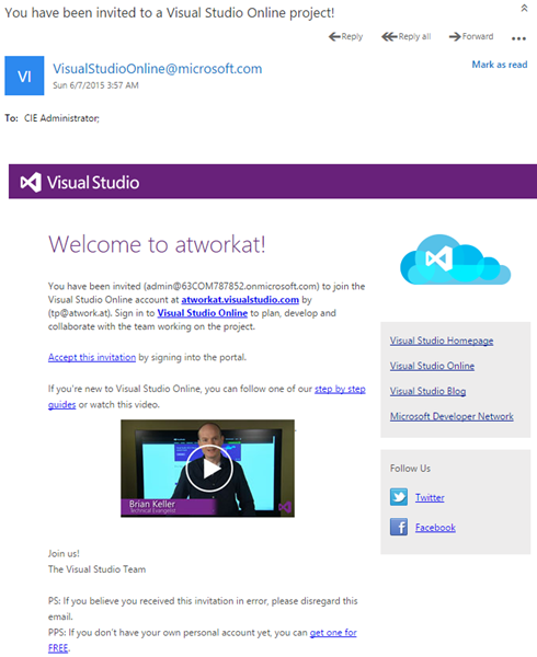 In diesem Beispiel wird eine Einladung an “irgendein” Microsoft-Konto gesendet. Der Benutzer erhält wie gewohnt seine Einladung und kann an VS Online mitwirken. Der Unterschied hierbei ist nur die Lizenzform.