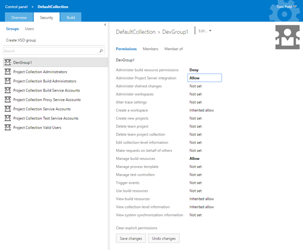 Zum Abschluss nochmals der Hinweis, in VS Online am besten Gruppen zu verwenden. Diese werden in den “Settings” und “Security” definiert wie in diesem Screenshot.