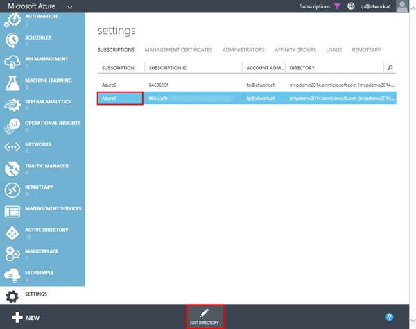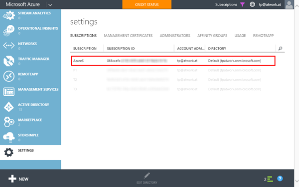 Im Azure Management Portal ist in *Settings / Subscriptions *in der Spalte “Directory” ersichtlich, welches das Standard-AAD (Default Directory) für eine Azure Subscription ist. Dies ist eine sehr wichtige Information, schließlich werden dort die User, Groups und Apps für die jeweilige Azure Subscription verwaltet.