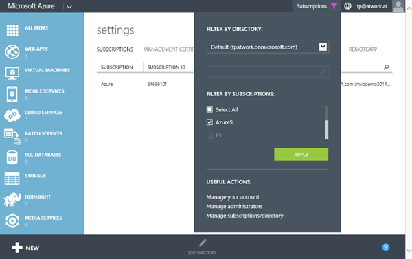 Hier existieren zwei Azure subscriptions (Azure and AzureS), die mit einem AAD (mvpdemo2014.onmicrosoft.com) verwaltet werden. Der interessante Aspekt ist, dass dieses AAD aus einer 30-Tage Office 365 Trial stammt, die seit mehr als eineinhalb Jahren nicht mehr aktiv ist. Irgendein Automatismus (oder Mensch?) hat dieses AAD ausgewählt und meinen Azure Subscriptions zugeordnet…