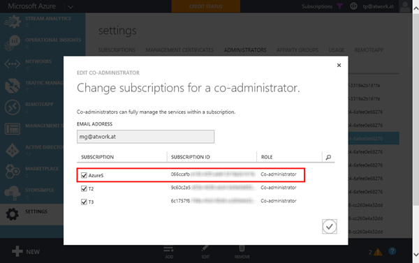 Ich hatte ein anderes Problem damit: Meine Situation war, dass ich in einem der beiden Azure Subscriptions keine Co-Admins hinzufügen konnte. Das Azure-Portal lieferte permanent einen Fehler: “The account ‘xy@atwork.at’ could not be made a co-administrator due to a directory error.” Mühsam…