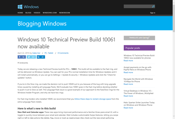 Wer bereits Windows 10 Technical Preview installiert hat, kann seit heute die neueste Version Build 10061 herunterladen und installieren. Diese Meldung wurde vor kurzem in Blogging Windows veröffentlicht: Windows 10 Technical Preview Build 10061 now available.