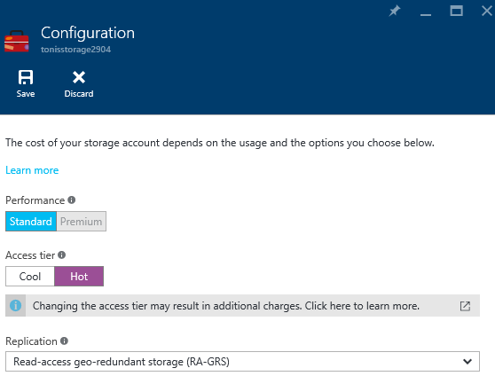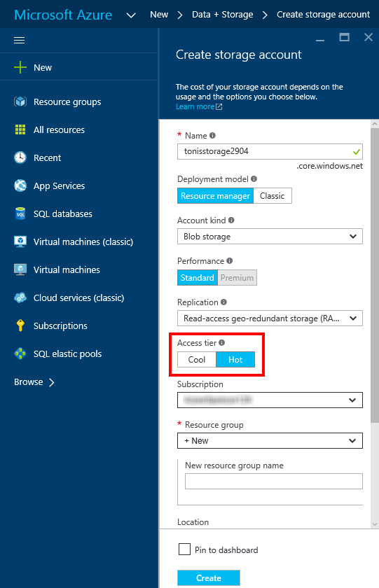 Mehr Details gibt es in der Getting started documentation. Seit heute ist die Funktion “GA”, also verfügbar. Wenn man also nun einen neuen Storage in Azure anlegt, ist der Access Tier auswählbar. Der folgende Screenshot zeigt den neuen Schalter.