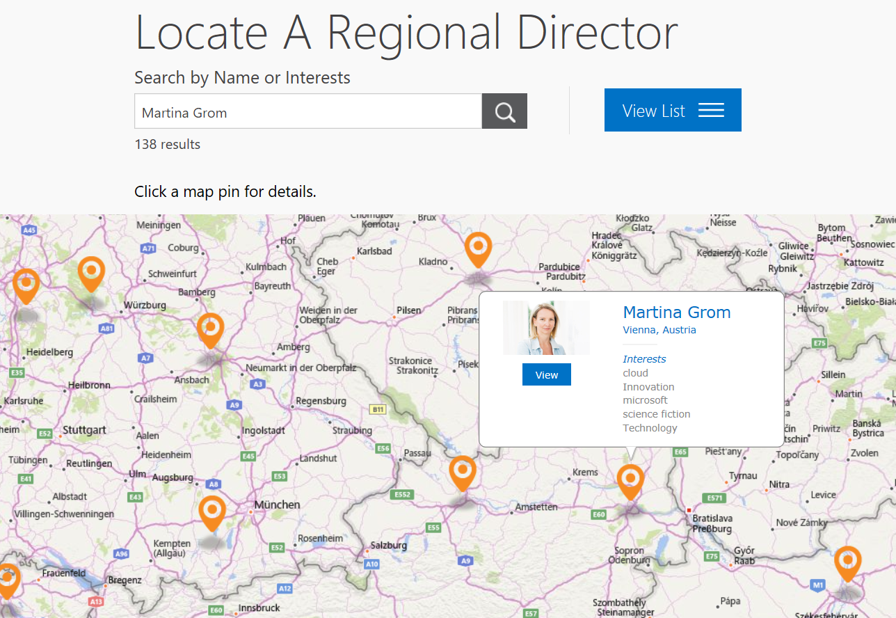 On the two-page website, Microsoft informs about the Regional Directors program and there’s a search function included. You can find RD’s easily and view the result in a map or in a list. When clicking on a person, there’s a link to the about.me page of the Regional Director, for example Martina Grom.