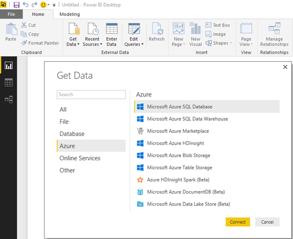 Now open the Power-BI Desktop, open the “Get Data” menu and connect to “Microsoft Azure SQL Database”.