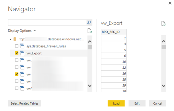 If the connection works, the following step allows to select the data you want to use in your Power-BI dashboard as in this sample.