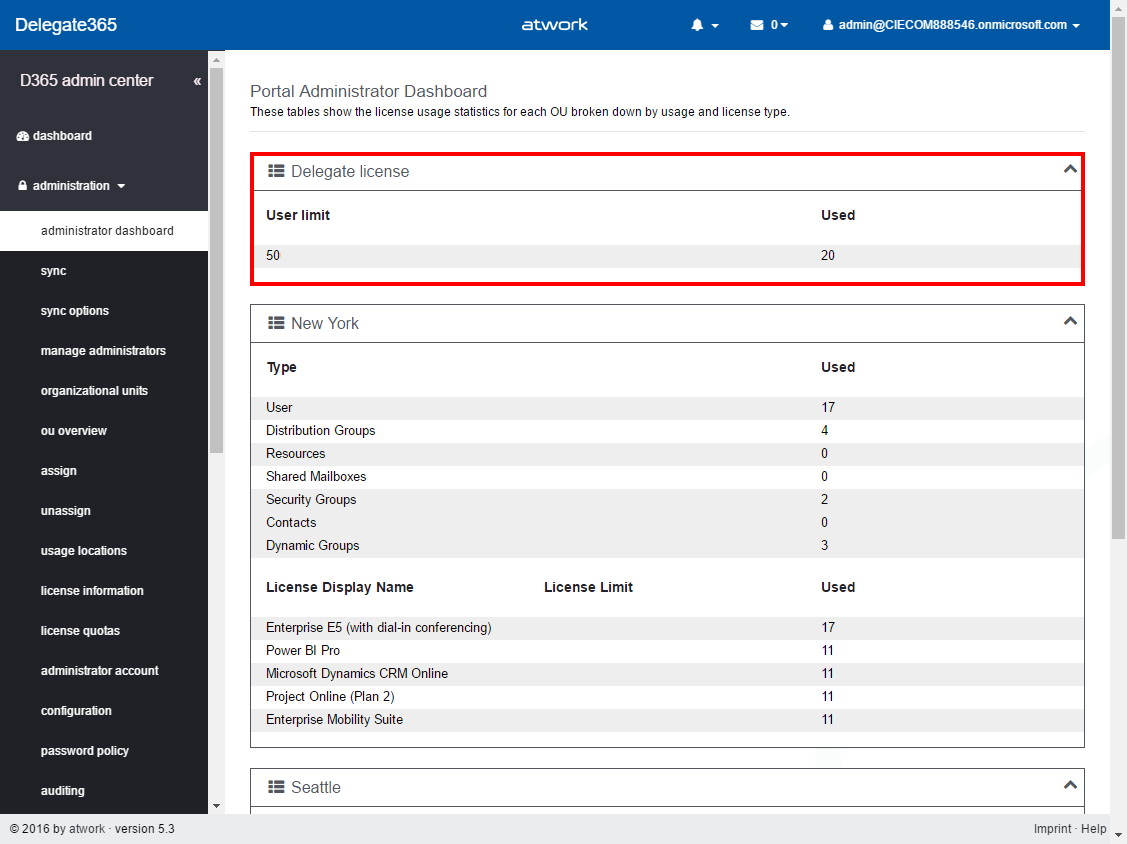 - New Administrator Dashboard: Portal Admins can see the Delegate365 licenses in the administration / administrator dashboard. In this sample 20 Delegate365 licenses are used out of 50. Find more information about the licensing in D365 here. The licenses have been extended with the thy “Type” section per OU. So Portal Admins get a quick overview which OU uses how many licenses and what types of objects.