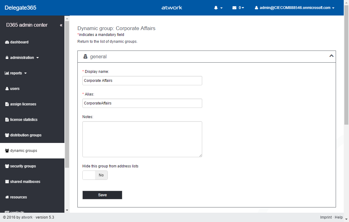 In “General” the Name, Alias and Notes can be set and it can be controlled if this dynamic group will show up in the address list or not.