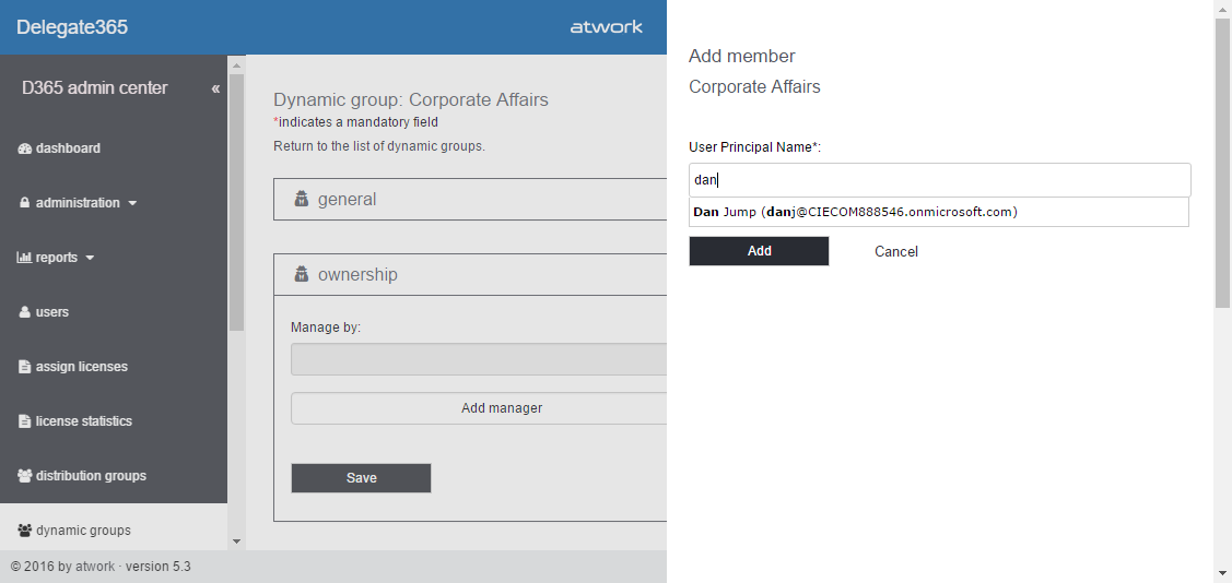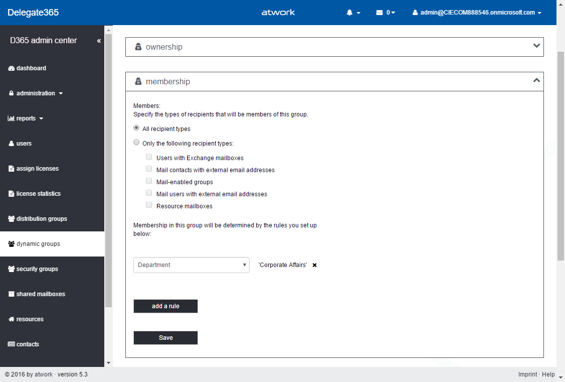 In “membership” the rules can be defined for finding users for that group. “add rule” creates a new line, the “x” icon removes an existing rule. This is the “key section” in the dynamic groups, since this defines who are members of that group by the defined rules, for example here all users who have their property “department” set to “Corporate Affairs” are member of that dynamic group.