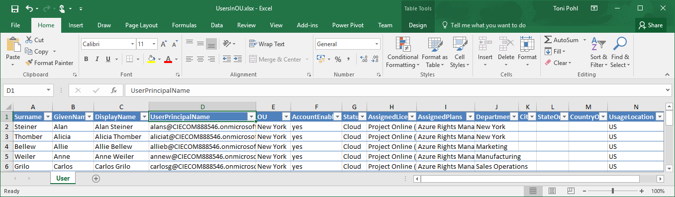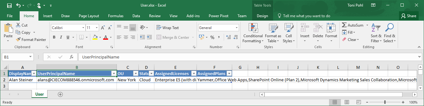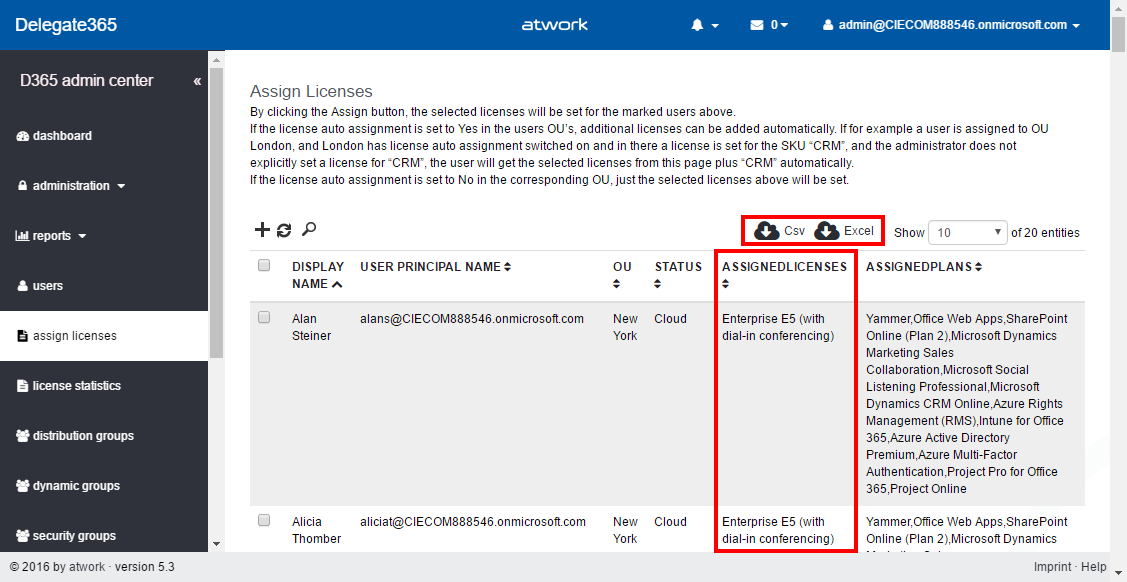 - Exporting assigned licenses: Now it’s possible to export all users with their assigned Office 365 licenses inclusive the license name. There is a new column “Assigned Licenses” additionally to the column “Assigned Plans”. This was available in former versions as well when exporting the list to a CSV or Excel file, but not visible in the shown list. This is helpful for further reporting or analysis filtered by license name.