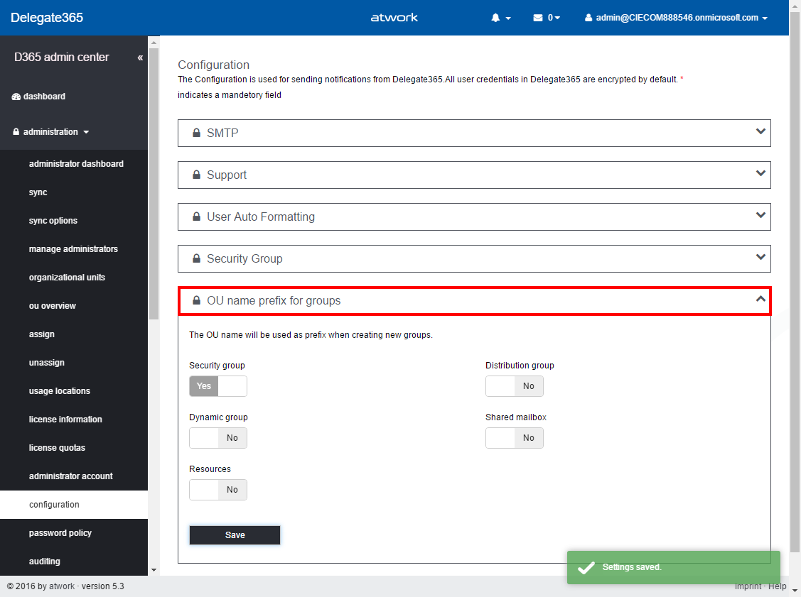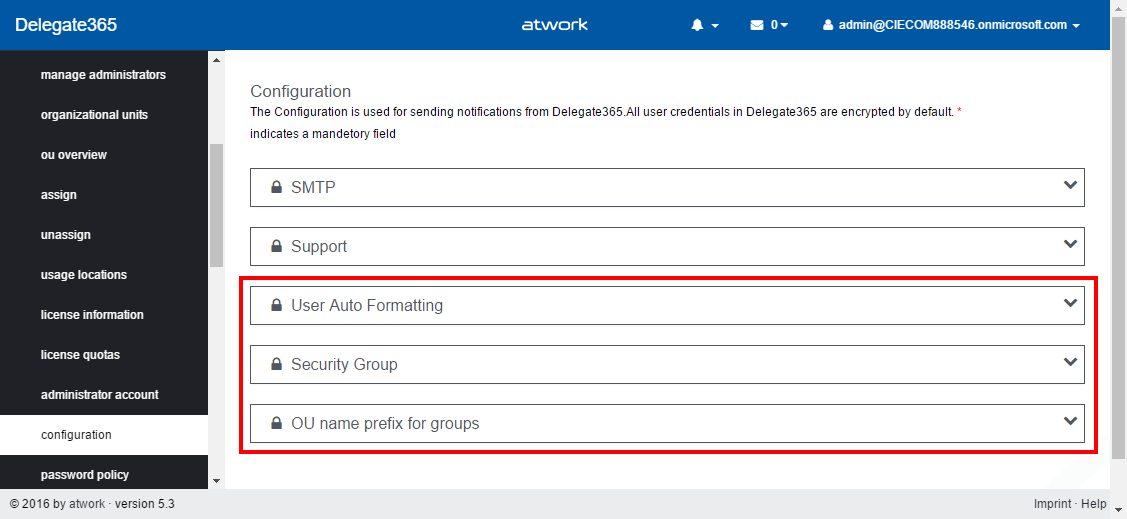 - New configuration rules: In administration / configuration there are new sections for helping Portal Admins to restrict specific naming conventions for their scope admins. The new sections are “User Auto Formatting”, “Security Group” and “OU name prefix for groups” and are described below.
