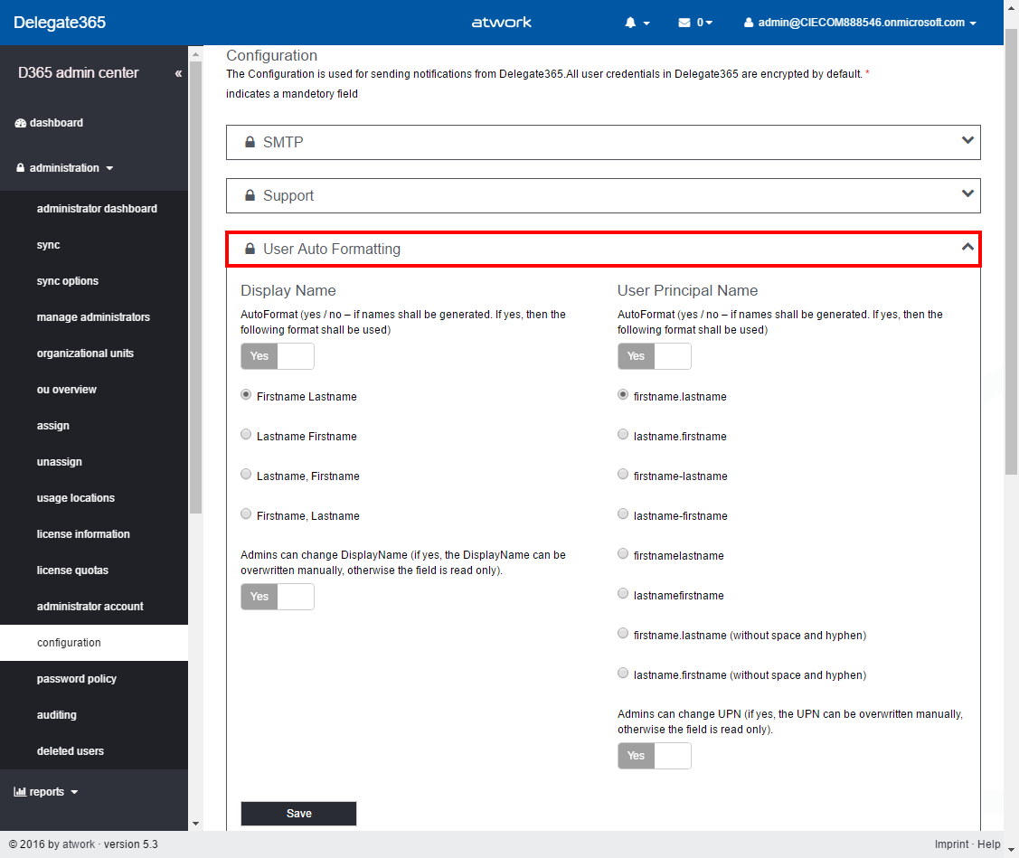 - User Auto Formatting: This new section enables Portal Admins to define how UPN and Display Name of new users must look like (if manually created in D365). As shown in the screenshot below, each rule can be switched on and off. If a switch is set to Yes, the user create form will use the rules defined here.