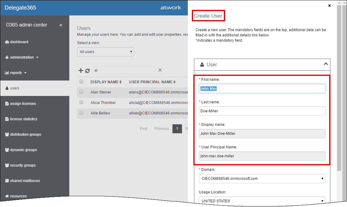 Display Name and UPN are automatically generated by the input of the First name and Last name fields and can (or can’t) be overwritten by the admin. This feature enables that user naming conventions are enforced uniformly in the Office 365 tenant. The settings are valid immediately for the whole D365 tenant.