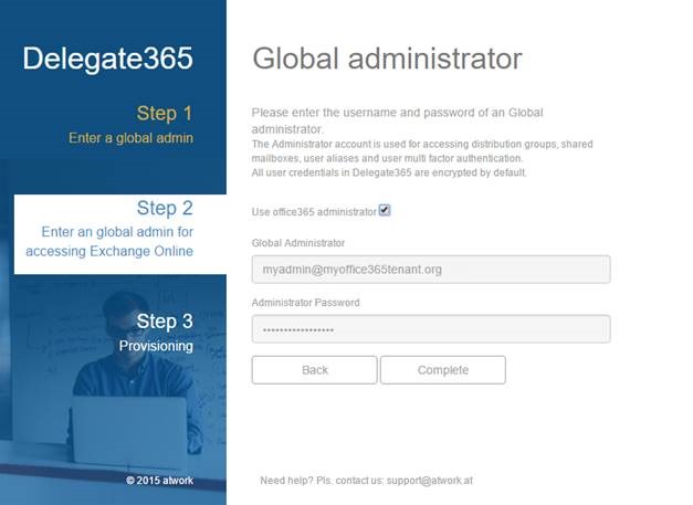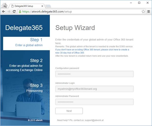 - You need to have the Delegate365 configuration password. If you don’t have that password, pls. contact support@atwork.at