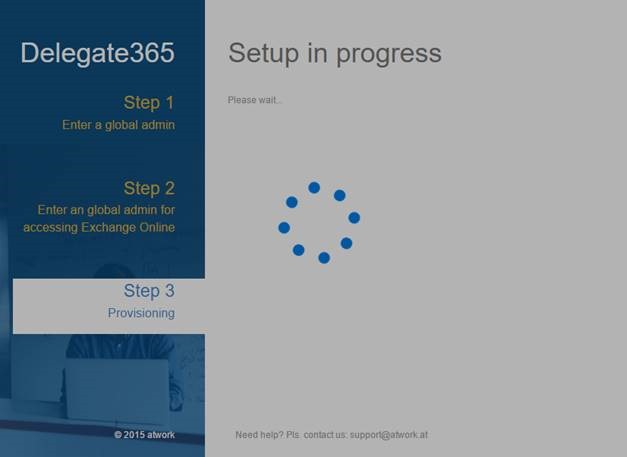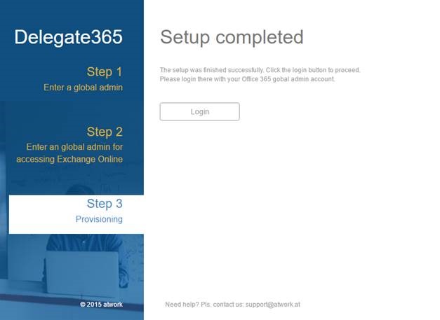 If anything went wrong, pls. check your credentials (login with your Global Admin Account on https://portal.office.com) or contact us for a new Delegate365 configuration password. Then retry the whole operation.