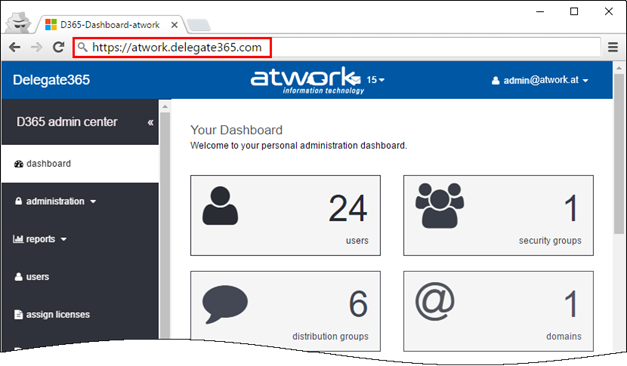 - Your Delegate365 portal must already be accessible with the new URL https://[yourcompanyname].delegate365.com (already prepared by atwork).