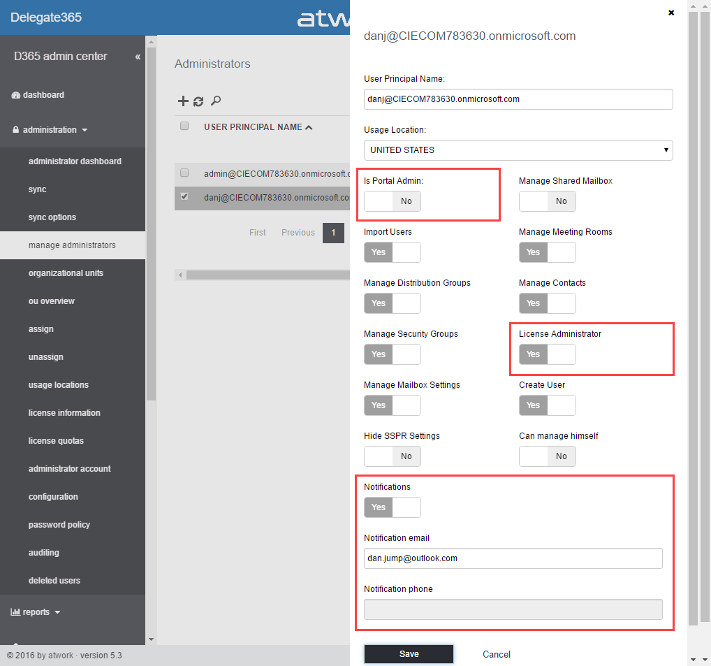 On order to receive emails, the Portal Administrator must open the administration / manage administrators and Edit admin feature of the Admin and set the Notifications switch to YES. There must be an email address stored as in the screenshot below. The email address used can be any email address (this means it can be the same as the Admin’s UPN or a different as in the sample above where another domain is used).