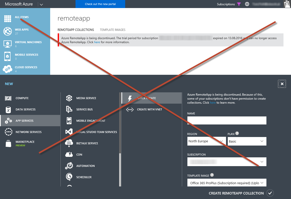 “Azure RemoteApp is being discontinued. The trial period for subscription *** expired on 13.08.2016 and can no longer access Azure RemoteApp. Click here for more information.”