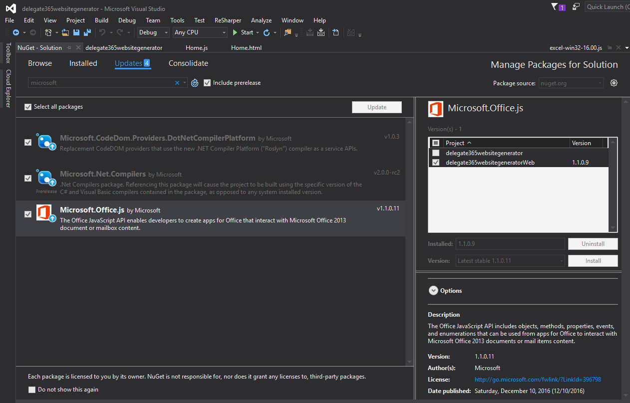 Update the version of your JavaScript API for Office and manifest schema files