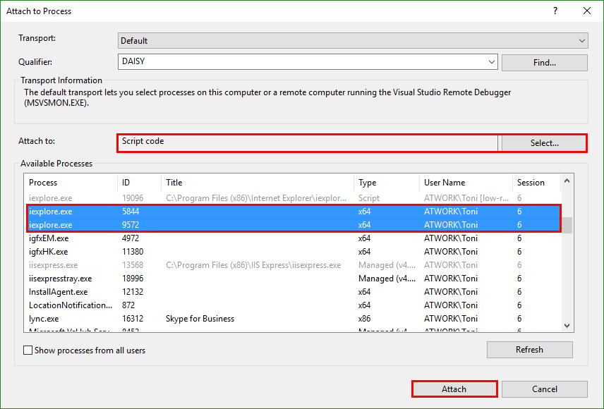 In Visual Studio, open the Debug / Attach to Process menu (or press Ctrl+Alt+P) and attach “Script code” to all active “iexplore.exe” instances as in this screenshot. Click Attach after configured.