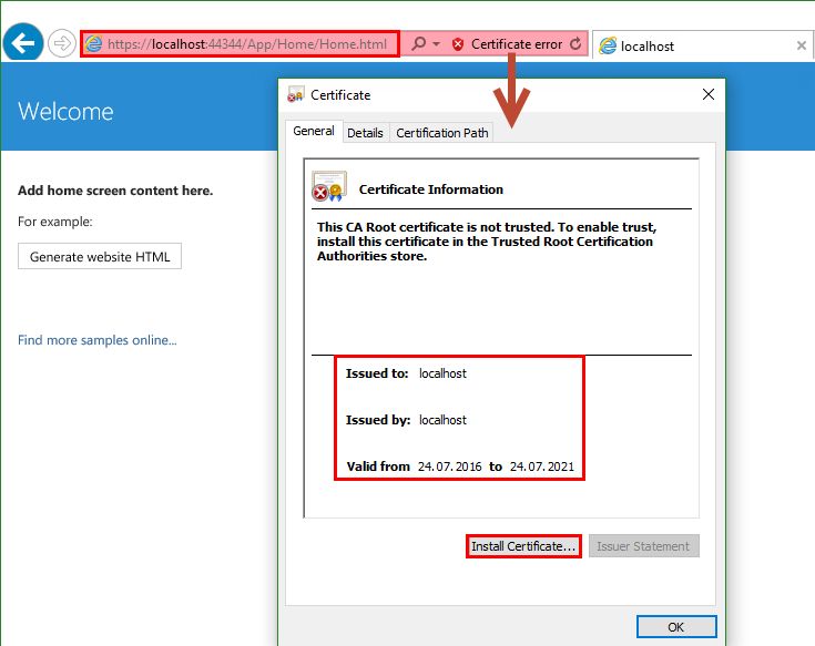 If you run into the same issue as I did (see invalidcert.htm in the JavaScript console above)… When IE opens your app URL and says it’s not trusted, then run the Office App, open IE and navigate to the app URL. You will see that your IE system does not know the localhost certificate. Double Click the Certificate Error in the address bar.